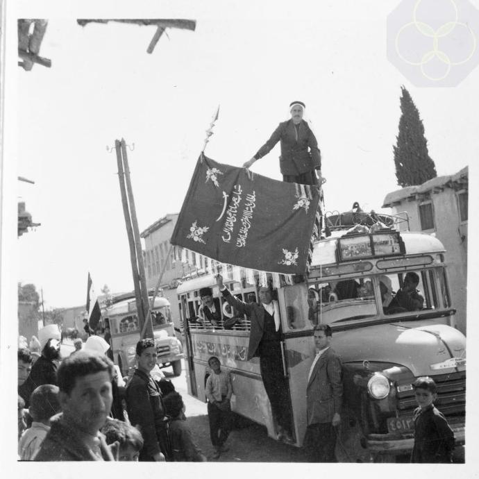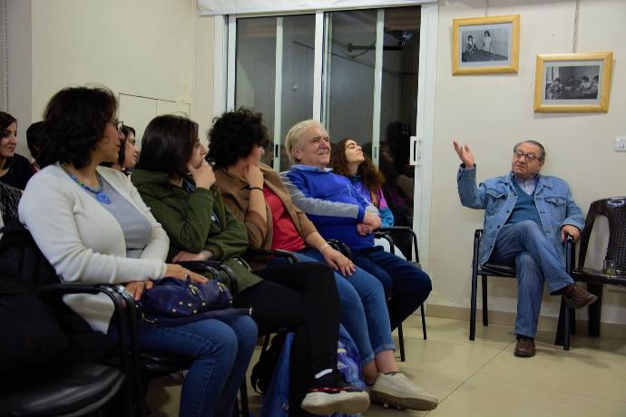The evening, which revolved around a photo taken in April 1954 during the popular celebrations of Independence Day, was attended by friends: Salwa Zakzak, Laila Halabi, and Marwa Melhem, with imaginary stories, while friend Mufid Karbaj participated with a story that documented the event in terms of time, place, and people, as well as documenting the celebratory flag raised in the photo, which was raised by the people of Jaramana for the first time in 1937, while receiving the commander-in-chief of the Great Syrian Revolution and his comrades returning from their exile in Wadi al-Sirhan.