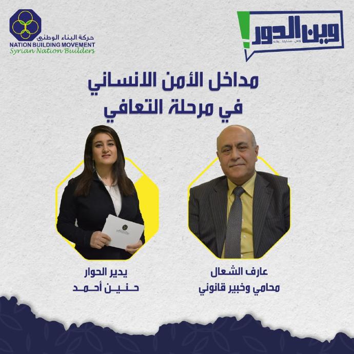 In the third session of the “Where is the Role” recovery series, lawyer Mr. Aref Al-Shaal - legal expert - focuses on the legal basis for achieving human security in the recovery phase and its legal approaches related to the issues of (kidnapped, missing, forcibly disappeared, detainees, displaced persons, refugees, and other issues).
