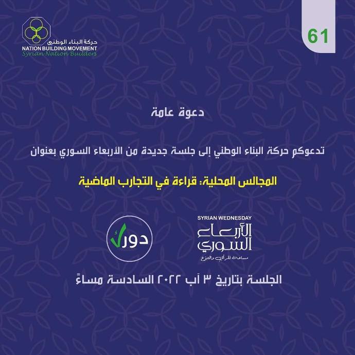 و بناء على ما سبق، تدعوكم حركةالبناءالوطني للمشاركة في الجلسة الواحدة والستين من برنامج "الأربعاء السوري" بعنوان: