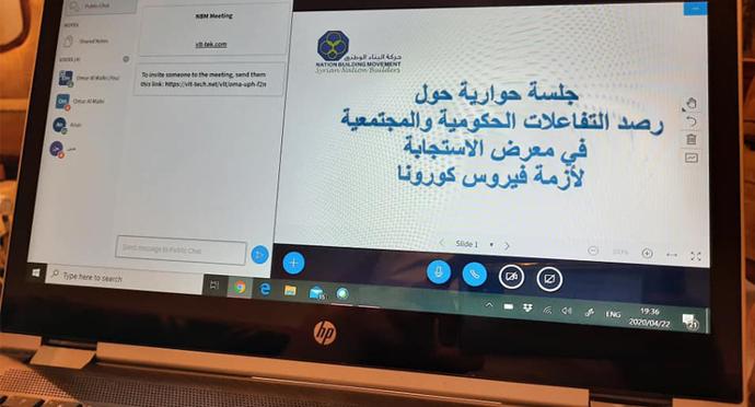 ناقشت الجلسة كيفية انخراط المجتمع المدني إلى جانب باقي القطاعات في المساعدة للتصدي لوباء كورونا، والمساحة المعطاة من قبل الحكومة للفرق المدنية لممارسة أدوارها بأريحية، واختتمت الجلسة بمجموعة توصيات.