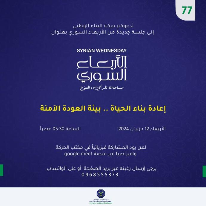 الجلسة 77 من جلسات "الأربعاء السوري" التي أطلقتها حركة البناء الوطني عام 2019، وطرحت فيها قضية اللاجئين والنازحين والتحديات والفرص لعودتهم إلى مناطقهم، وذلك بحضور عدد من الناشطين/ات، والمختصين/ات في قضايا المرأة والشأن العام.
