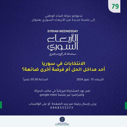 شارك عدد من الناشطين المدنيين والخبراء من مختلف الجغرافيات السورية ومن الداخل والخارج فيزيائياً وأونلاين في الجلسة السبعين من برنامج الأربعاء السوري والتي خصصتها حركة البناء الوطني لإطلاق سلسلة التعافي السوري بمداخلها السبع.