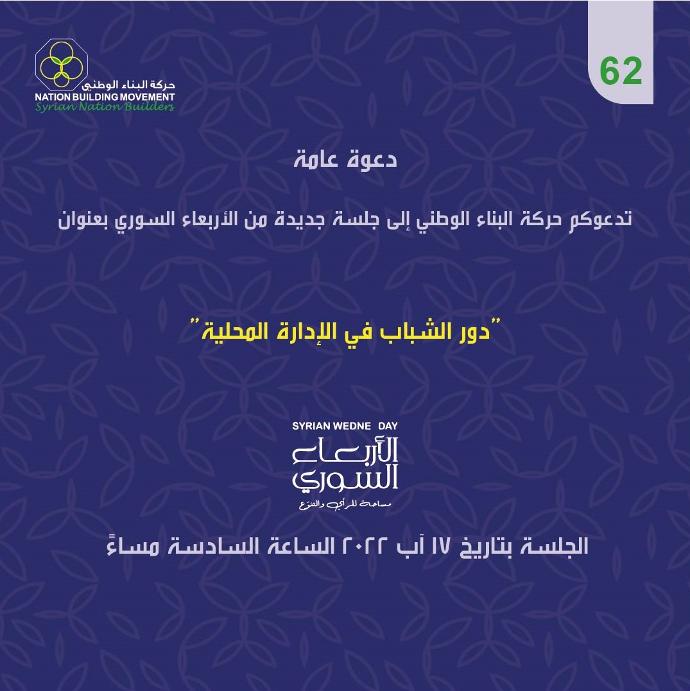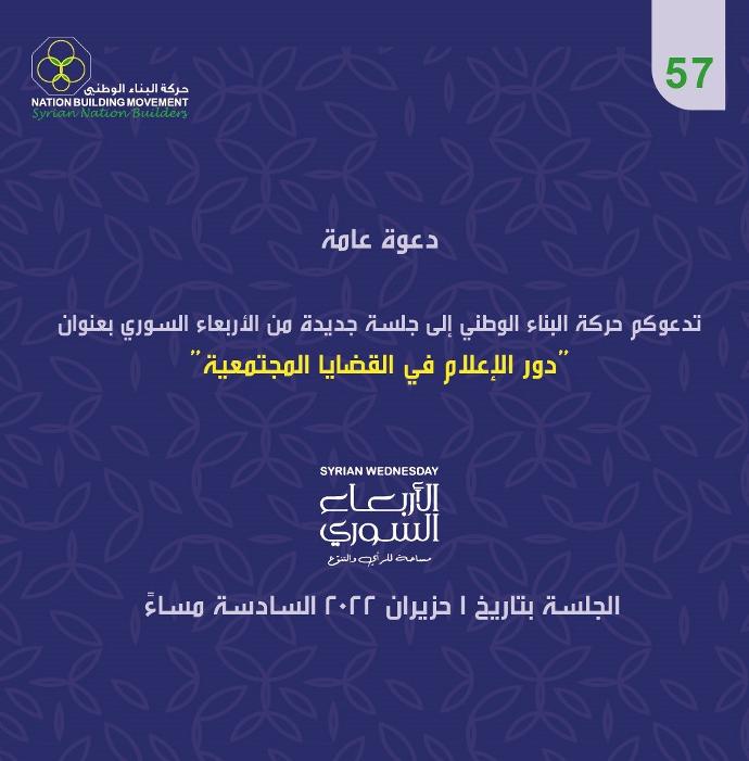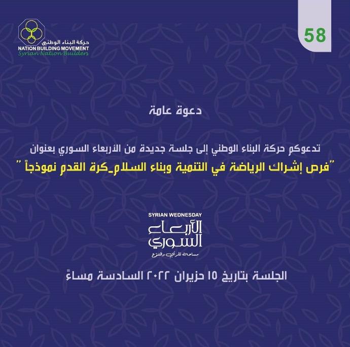 عقدت حركة البناء الوطني الجلسة الثامنة والخمسين من برنامج الأربعاء السوري بعنوان: "فرص إشراك الرياضة في التنمية وبناء السلام - كرة القدم نموذجاً" وذلك في مكتب الحركة بدمشق يوم 15 حزيران 2022، وذلك بمشاركة مجموعة من الخبراء والمدربين واللاعبين والإعلاميين والناشطين.