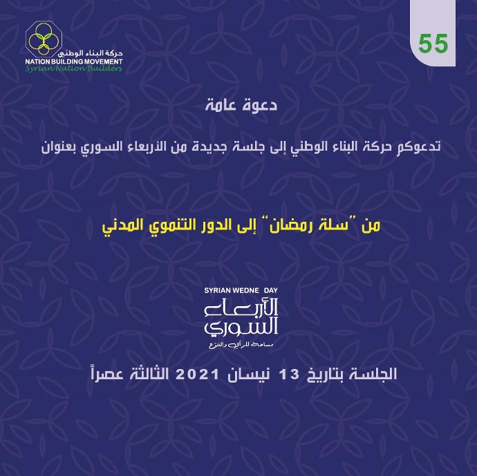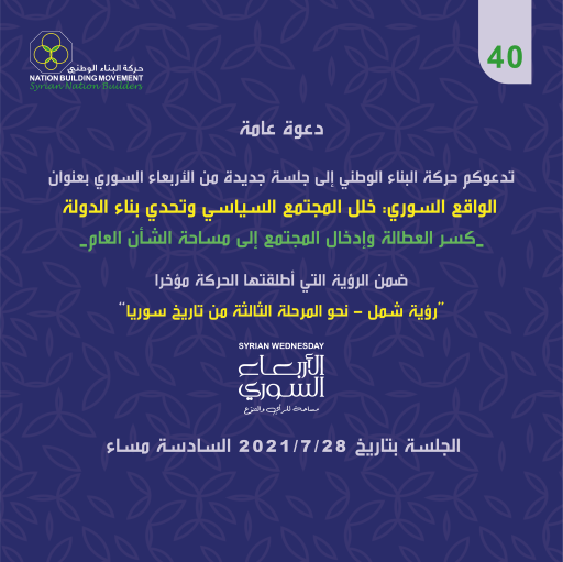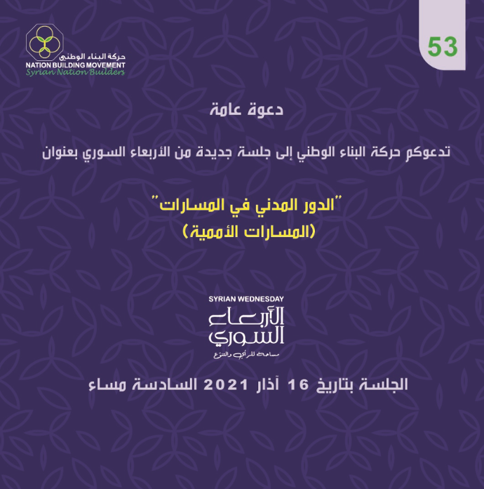 عقدت حركة البناء الوطني الأربعاء 2/ 3/ 2022 الجلسة الثانية والخمسين من برنامج "الأربعاء السوري" التي حملت عنوان "المسؤولية المدنية في سوريا"، بمشاركة مجموعة من الفاعلين والناشطين المدنيين.