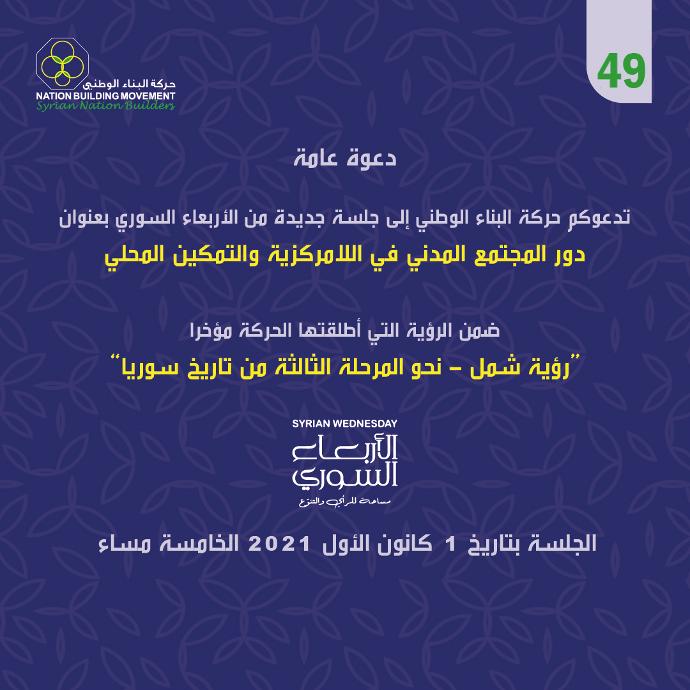 واصلت حركة البناء الوطني جلسات "الأربعاء السوري" التي تناقش رؤية "شمل نحو المرحلة الثالثة_من_تاريخ_سوريا" ووصلت إلى آخر المفاهيم التي تضمنتها الرؤية وهو مفهوم "اللامركزية". وعقدت الجلسة التي حملت الرقم (49) والعنوان "اللامركزية: إشكالات وفرص" في 1 كانون الأول بحضور مجموعة من الخبراء والناشطين في مكتب الحركة وافتراضياً عبر منصة "زووم" الإلكترونية.