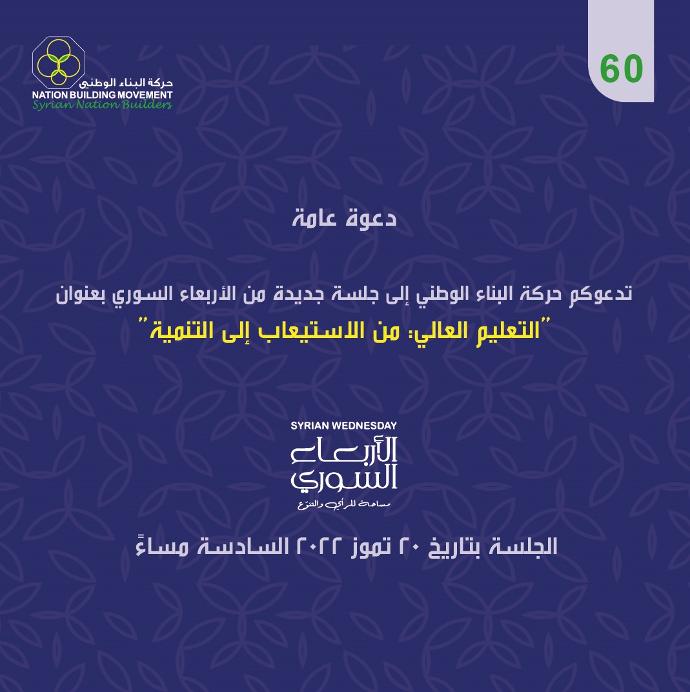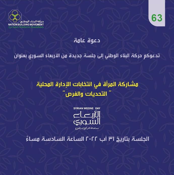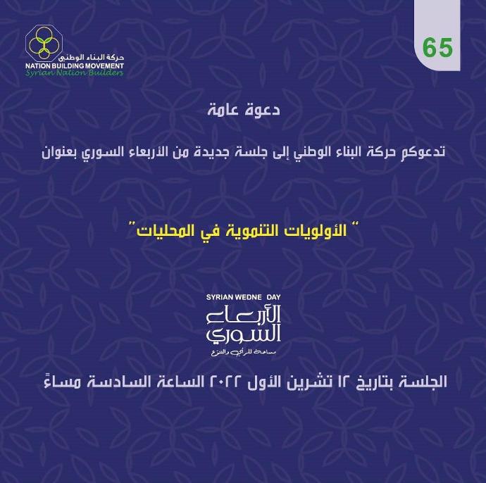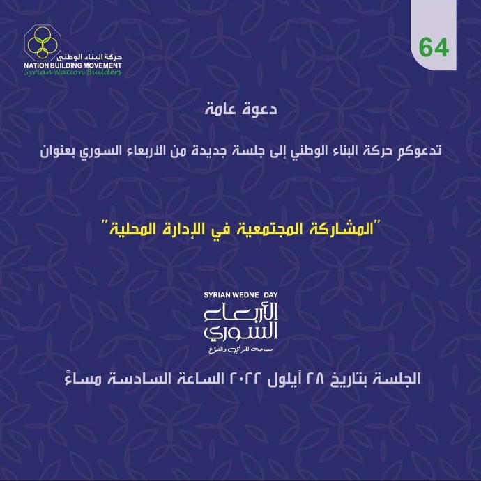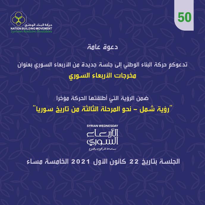 واصلت حركة البناء الوطني سلسلة جلسات الأربعاء السوري لعام 2022، حيث بدأت السلسلة الجديدة بعقد الجلسة (51) في مقر الحركة بدمشق بتاريخ 16 شباط 2022 ، وذلك بحضور عددٍ من الناشطين والمهتمين بالشأن العام، وافتراضياً عبر منصة (Google meet) الالكترونية، تحت عنوان " قراءة في المتغيرات الدولية و الإقليمية وأثرها على الواقع السوري"