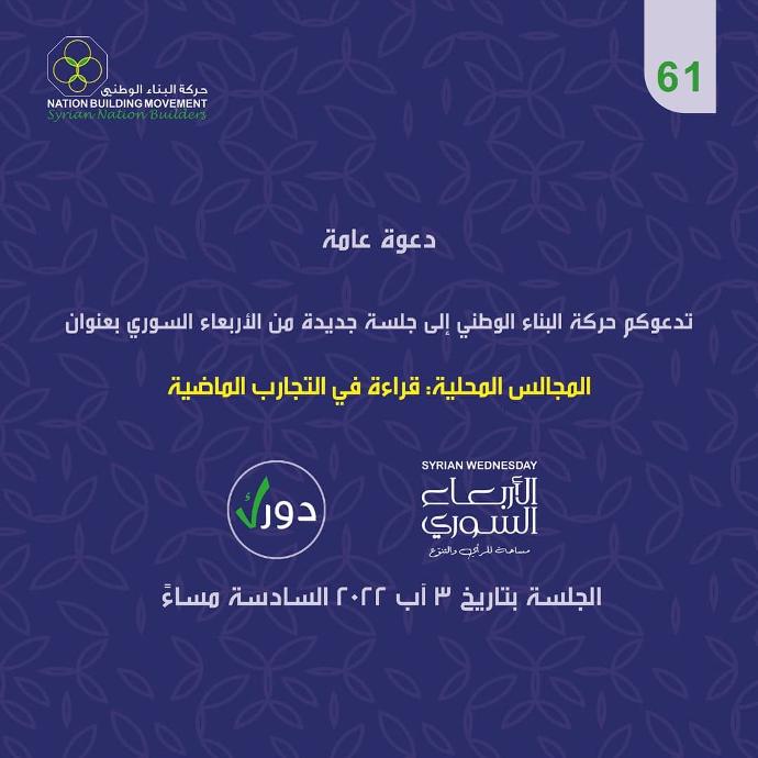 تشكل الإدارة المحلية مساحة مهمة للتمثيل والمشاركة في المجتمعات المحلية ، ومع استمرار حملة دورك بنسختها الثانية كانت الأولويات التنموية في المحليات حاضرة على طاولة الأربعاء السوري ، عقدت حركة البناء الوطني جلستها الــ65، بحضور عدد من الناشطين/ات والصحفيين/ات .