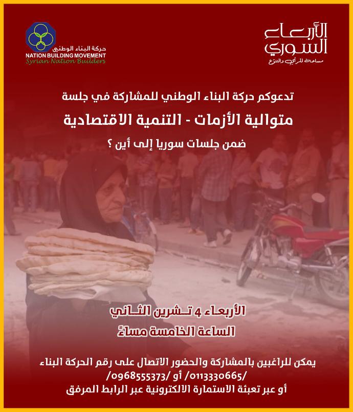 عقدت حركة البناء الوطني في مقرّها بدمشق ضمن برنامج الأربعاء السوري، الجلسة الحوارية رقم "73" بعنوان: "سوريا.. أين؟! اجتماعياً واقتصادياً".. مجتمع مشتت يدفع فاتورة الحرب.